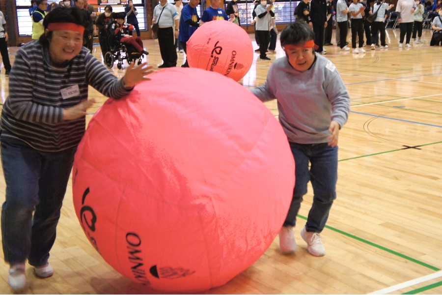車いすの方だけの競争や、2人一組での大玉ころがしでスピード?を競い合います。